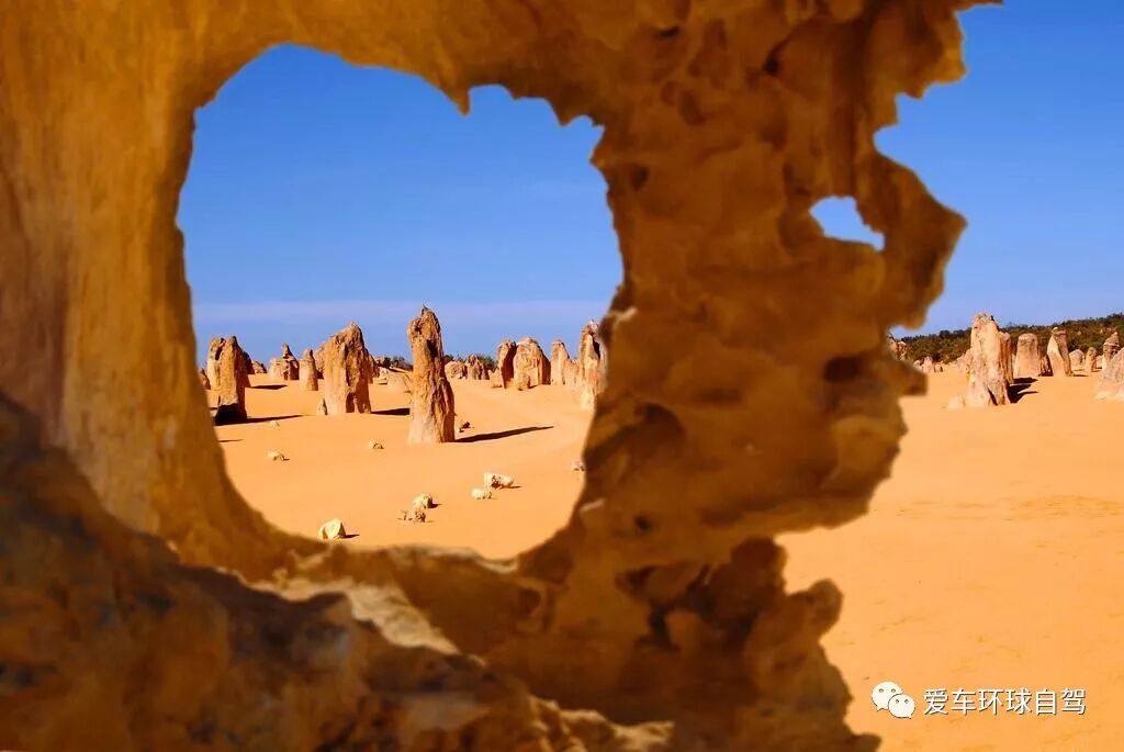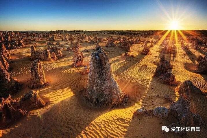 奇形怪状的石柱遍布在沙漠中形成独特的奇观,在平坦的沙丘中,四处矗立着石灰岩尖塔式的石笋。最高的有1.5英尺,小的只有手指头那样大,犹如古战场的布阵,被誉为“尖峰石阵”。当年荷兰探险家从船上望到这片石灰岩柱的沙漠景观时,还以为发现了一座远古时代的城市废墟。实际上这些尖塔式岩石景观是一中地质变化的自然现象。大约在3万年前,长在稳定的沙丘上的植物根部,经过长时间的风化,形成了石灰岩。植物死后,沙丘的不断移动,使这些钙化的石灰岩露出地表,形成了现在所看到的石笋。